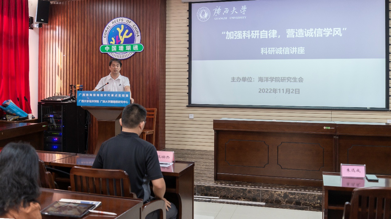 讲座首先由公司党委副书记朱迅成老师致辞,朱老师和同学们说明了举办此次讲座的目的和意义,希望同学们应当严于律己,诚信科研。
