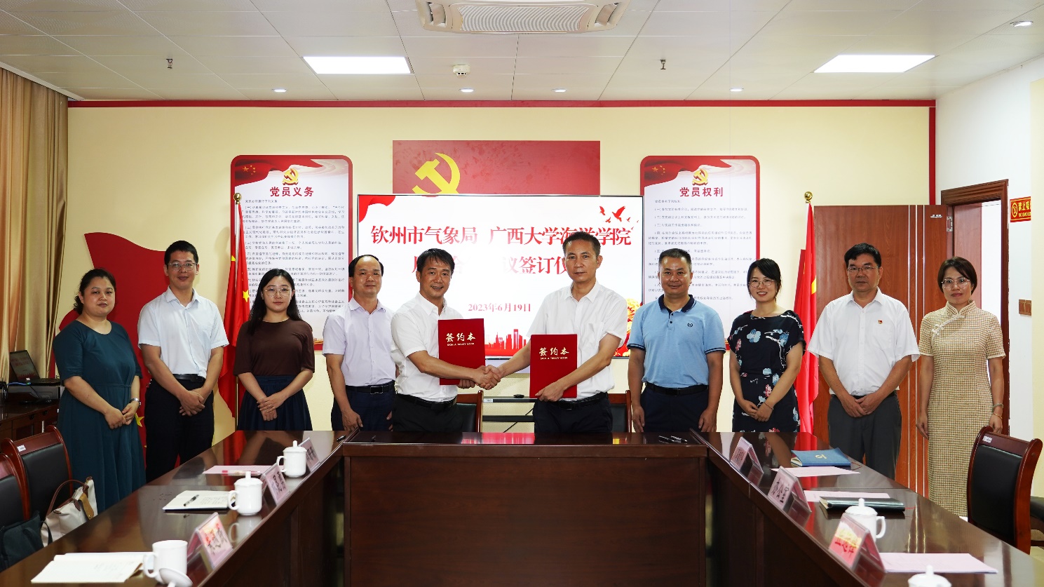 伟德国际victor1946朱迅成副书记(中左)、钦州市气象局副局长朱敬海(中右)代表双方签署协议