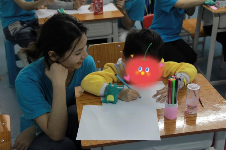 志愿者成员劳子彤在协助小朋友进行绘画