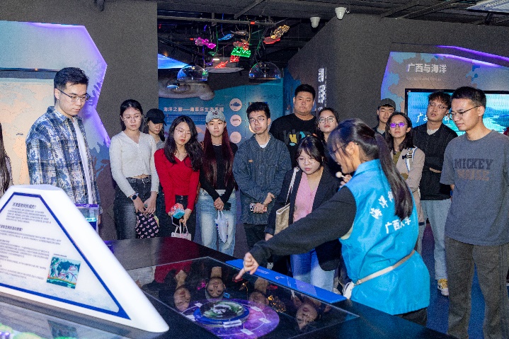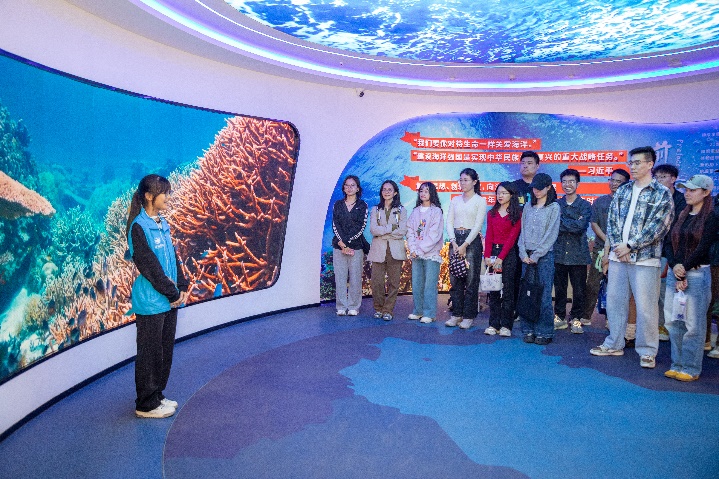与此同时,在bv伟德国际1946海洋科教馆内,品牌志愿服务项目实践基地参观活动也在有序进行。来自公司“蓝色梦想”志愿服务团的志愿者们带领大家深入了解海洋科教馆,通过实地参观和专业讲解,提高大家的海洋知识素养。馆内还设置了海洋知识科普区,师生们通过参与海洋知识问答,集章兑换精美海洋文创周边,志愿者们将宣教与互动结合,在趣味互动中增强了同学们的海洋保护意识,呼吁广大师生从点滴做起,参与海洋生态保护公益行动,守护祖国蔚蓝。
