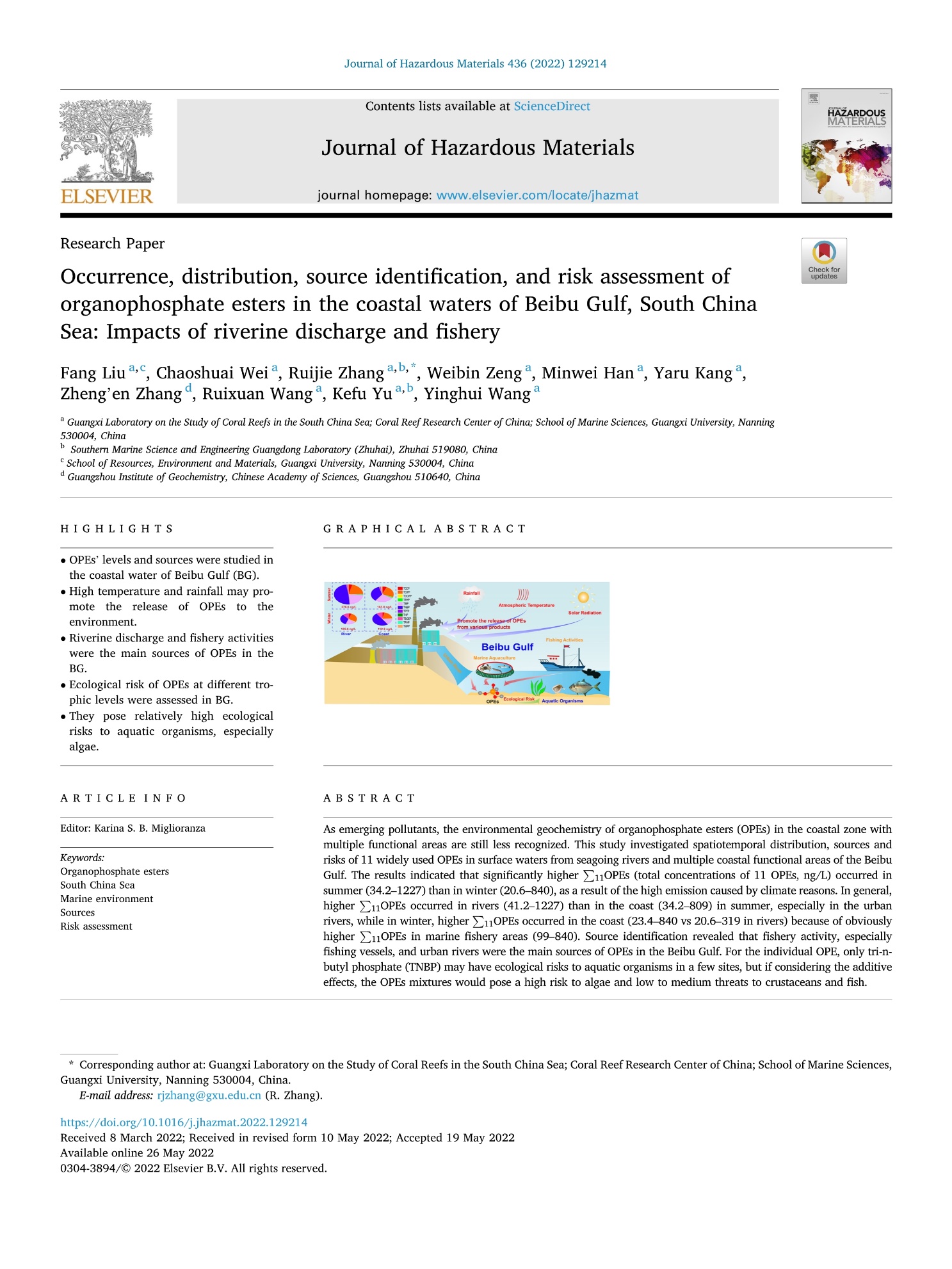 论文详情:Liu, F., Wei, C., Zhang, R., Zeng, W., Han, M., Kang, Y., Zhang, Z.e., Wang, R., Yu, K., Wang, Y., 2022. Occurrence, distribution, source identification, and risk assessment of organophosphate esters in the coastal waters of Beibu Gulf, South China Sea: Impacts of riverine discharge and fishery. J. Hazard. Mater. 436.