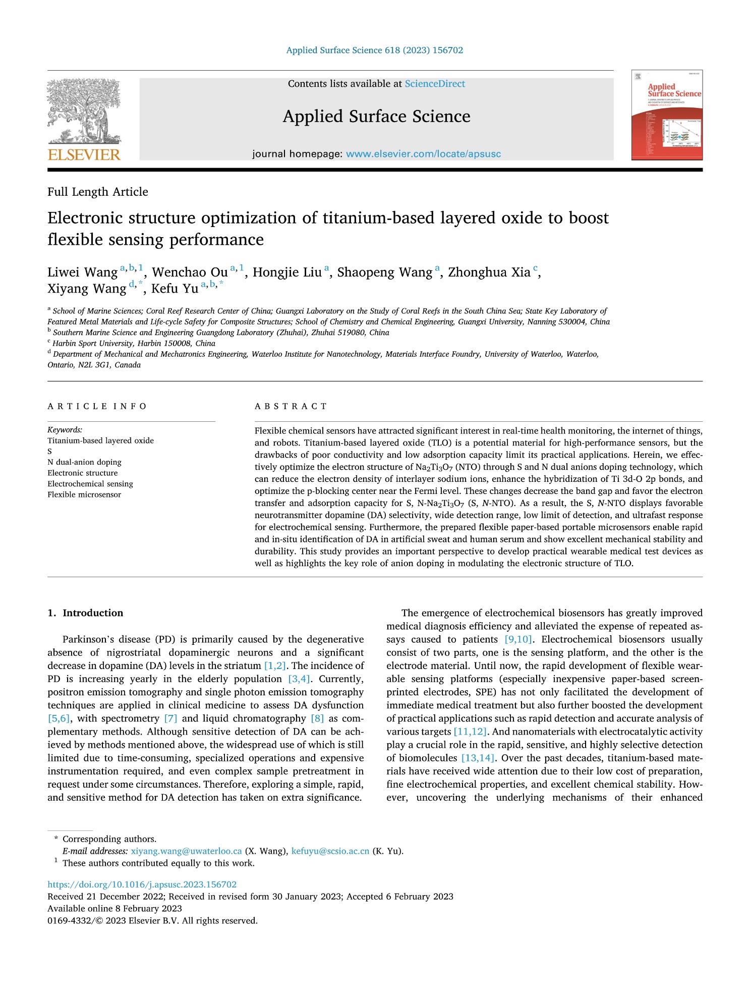 Wang Liwei#, Ou Wenchao#, Liu Hongjie, Wang Shaopeng, Xia Zhonghua, Wang Xiyang, Yu Kefu. (2023). Electronic structure optimization of titanium-based layered oxide to boost flexible sensing performance, Applied Surface Science, 618: 156702. https://doi.org/10.1016/j.apsusc.2023.156702