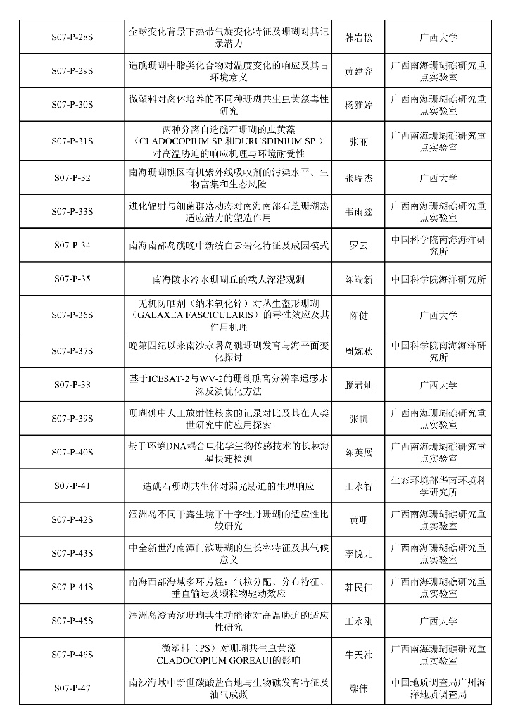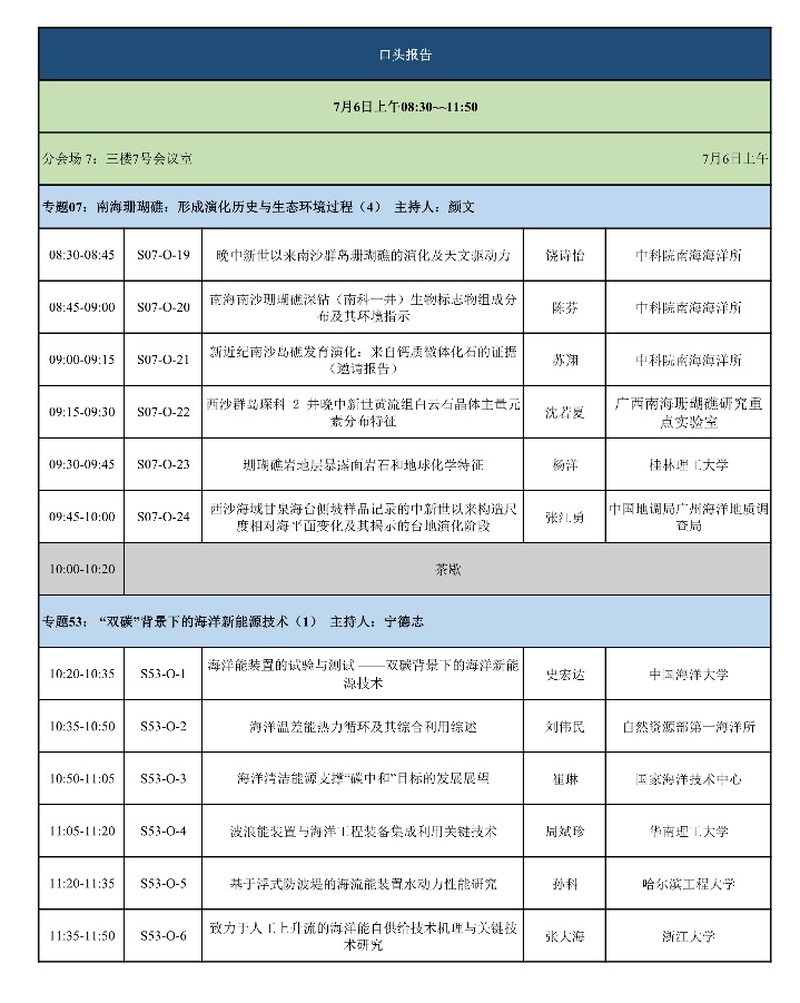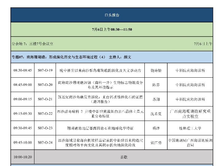 “南海珊瑚礁”专题口头报告日程