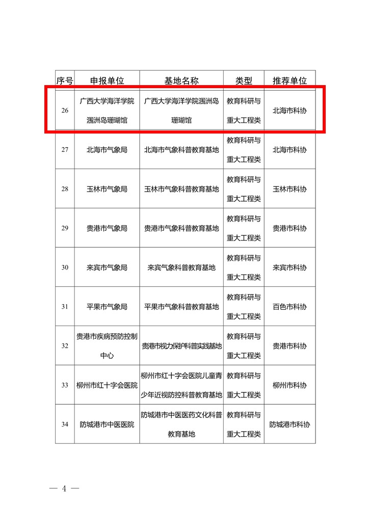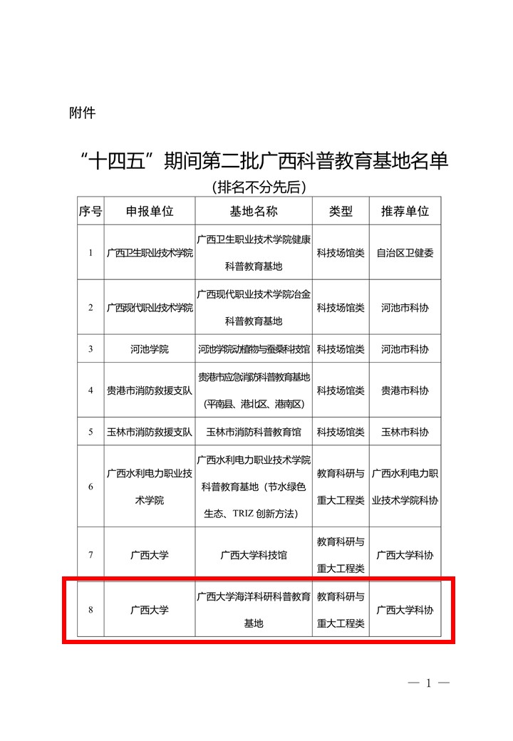 近日,自治区科学技术协会下发了《关于认定“十四五”期间第二批广西科普教育基地的通知》,公司“bv伟德国际1946海洋科研科普教育基地”、“伟德国际victor1946涠洲岛珊瑚馆”等2个基地分别入选(期限为2023—2027年)。
