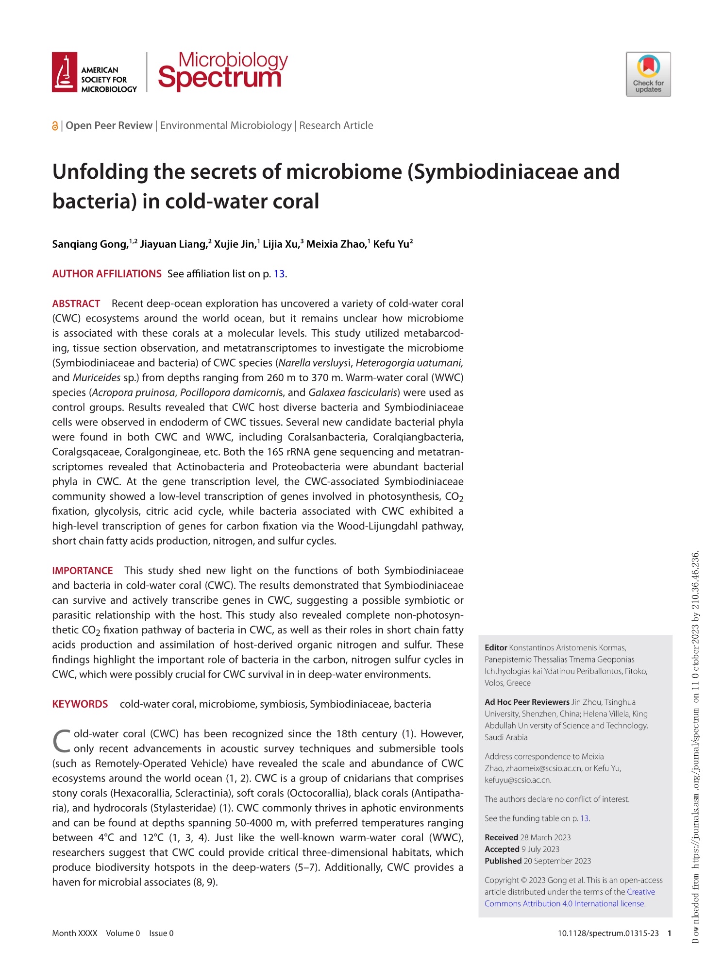 近日,广西南海珊瑚礁研究重点实验室客座研究员巩三强(中国科公司南海海洋研究所博士)为首在中国科公司一区Top期刊Microbiology Spectrum发表了题为 “Unfolding the secrets of microbiome (Symbiodiniaceae and bacteria) in cold-water coral”的研究论文。该研究结合细菌16S及藻类ITS2 barcodes高通量扩增测序、宏转录组测序及组织切片观察等技术, 首次在冷水珊瑚中确证了具有细胞活性的虫黄藻类群(Cladocopium 和Durusdinium)的存在,并在基因转录水平重构了完整的冷水珊瑚中虫黄藻的关键代谢途径, 包括光合碳固定等。 该研究初步界定了几个丰度较高的细菌新类群, 其中包括2个潜在的细菌新门:命名为珊瑚三(Coralsanbacteria)和珊瑚强(Coralqiangbacteria)细菌门,其中Coralsanbacteria可能是光合细菌蓝藻的祖先类群,并在基因转录水平重构了完整的冷水珊瑚中细菌的关键代谢途径,包括古老的非光合CO2 固定通路(the Wood-Lijungdahl pathway),硫循环通路(inorganic sulfur assimilation and organic sulfur disassimilation pathways),短链脂肪酸合成通路(short chain fatty acids synthesis pathways for acetate, butyrate, and propionate)等。