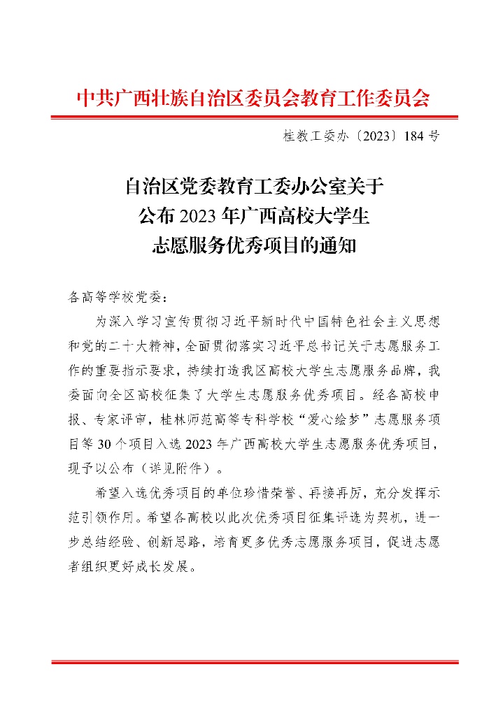 近日,自治区党委教育工委办公室公布了2023年广西高校老员工志愿服务优秀项目名单,公司《“蓝色梦想·科普先行”海洋知识科普志愿服务项目》入选“2023年广西高校老员工志愿服务优秀项目”30个入选项目之一。