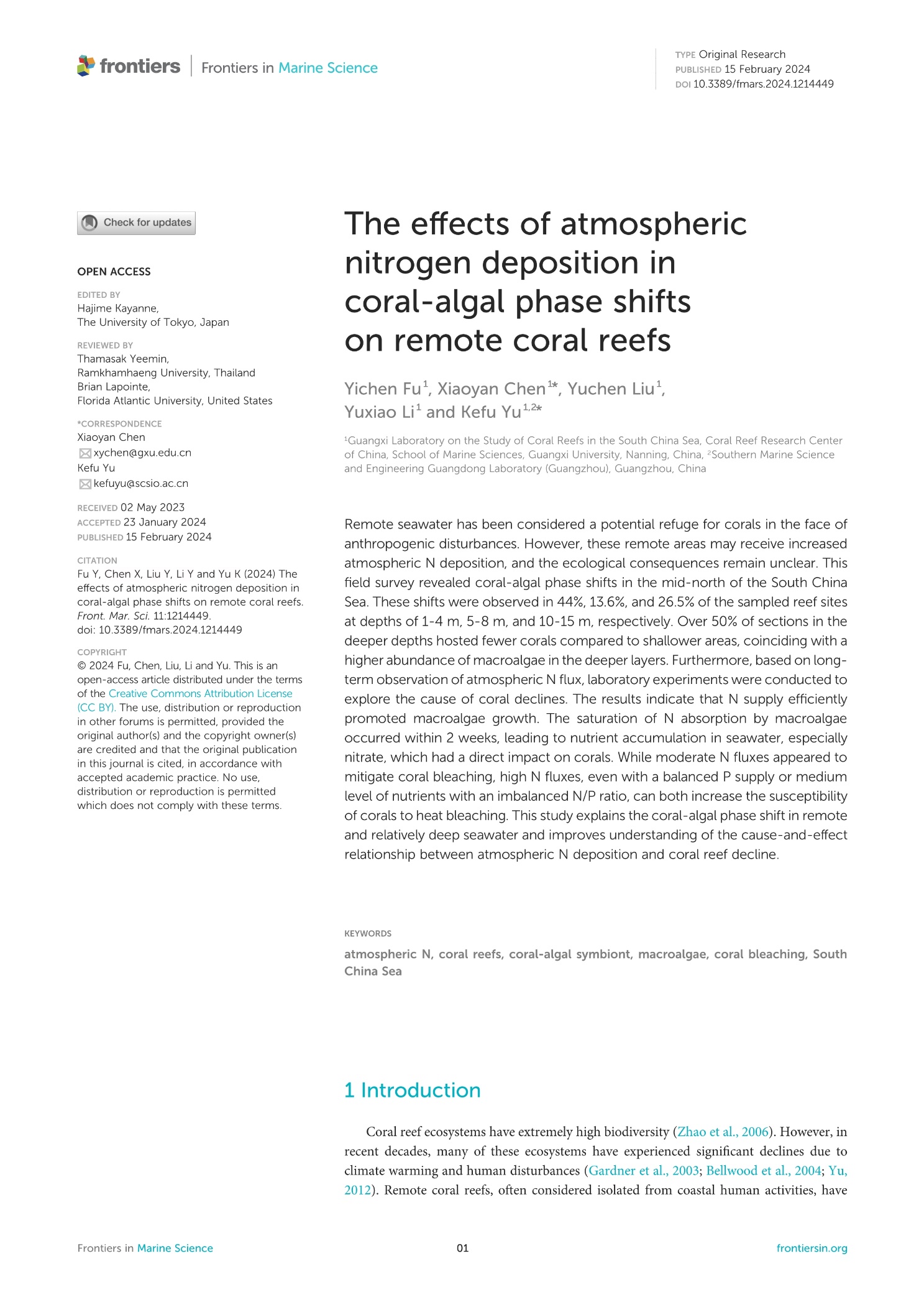 Fu Y, Chen X, Liu Y, Li Y and Yu K (2024) The effects of atmospheric nitrogen deposition in coral-algal phase shifts on remote coral reefs. Front. Mar. Sci. 11:1214449. doi: 10.3389/fmars.2024.1214449