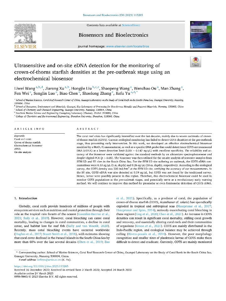 (1) 首创性地构建了一种长棘海星eDNA电化员工物传感平台,并实现了珊瑚礁区海域科考现场快速准确、原位评估长棘海星的存在情况。该技术为示踪和预警长棘海星的暴发提供了新思路和技术支持,相关成果发表在中国科公司1区TOP期刊Biosensors and Bioelectronics, 2023, 230, 115265. (IF=12.6)链接:https://doi.org/10.1016/j.bios.2023.115265.
