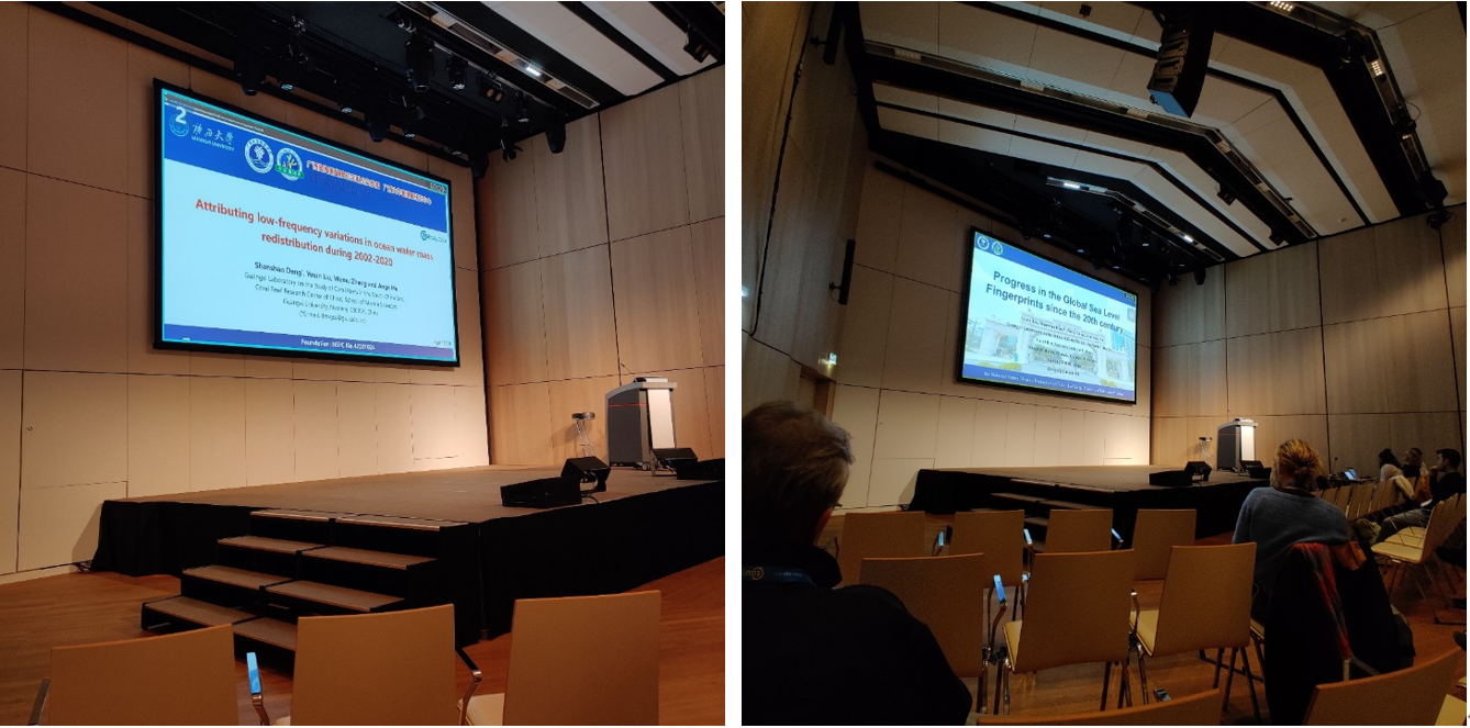 在“Climate: Past, Present & Future”主题的“Understanding sea level changes: global to local, from past to future)”分会场,邓珊珊博士作了题为“Attributing low-frequency variations in ocean water mass redistribution during 2002-2020”的口头报告,介绍关于气候变化背景下低频陆-海水质量再分布的特征与归因的最新研究进展。21级硕士研究生刘宇欣作了题为“Progress in the Global Sea Level Fingerprints since the 20th century”的口头报告,介绍关于20世纪以来三种气候变化背景下陆地水储量异常驱动的海平面指纹时空演变特征的最新研究进展。