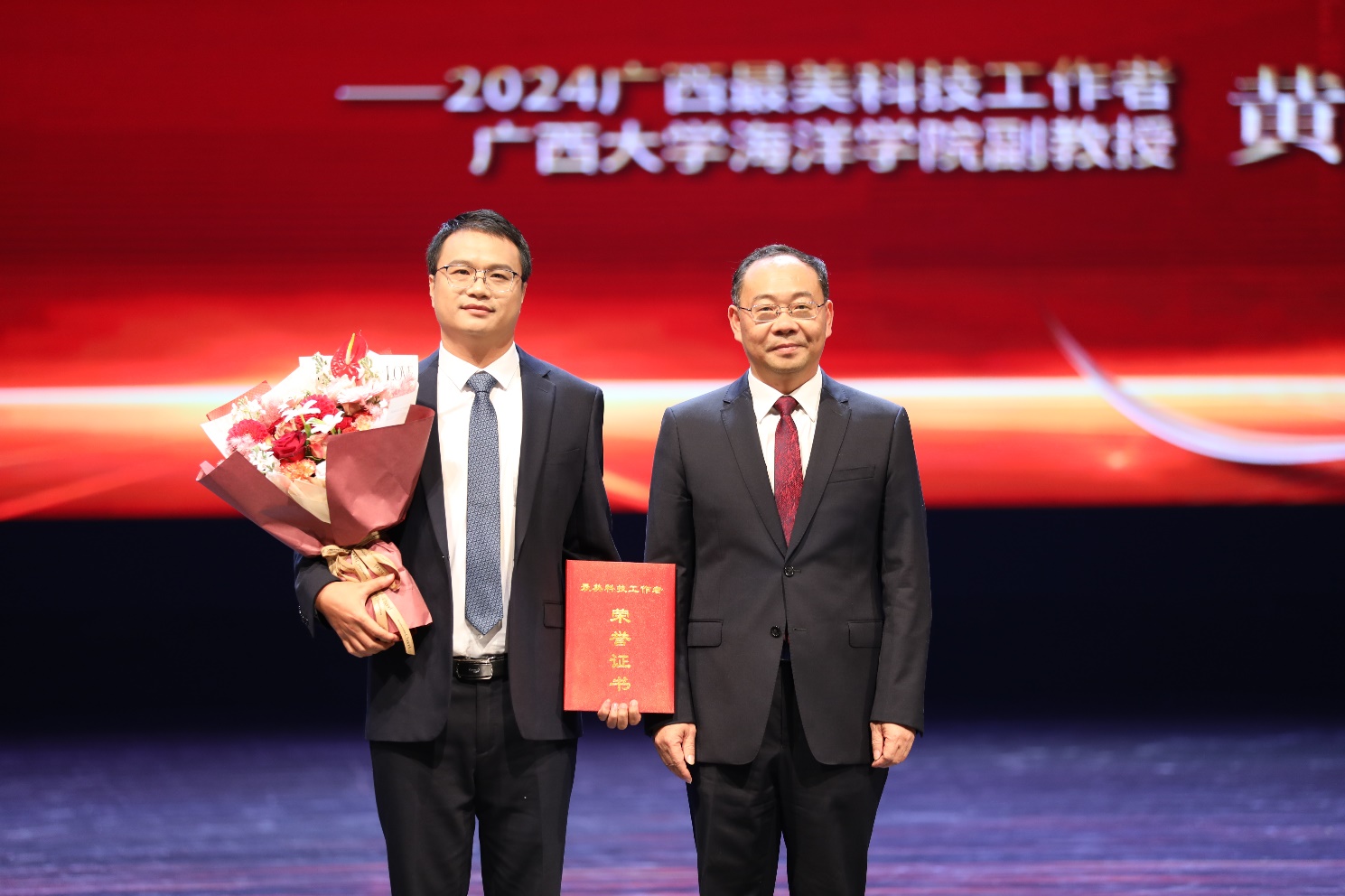 2024年12月5日,“科界榜样——2024广西最美科技工作者发布仪式”在bv伟德国际1946汇学堂隆重举行,公司黄雯老师荣获2024年广西“最美科技工作者”荣誉称号,公司党委常委、副董事长于文进为黄雯颁发荣誉证书,大会给予黄雯的致敬词为:浩渺碧波间,他是屡赴深蓝的无畏勇者;碎影礁丛中,他是妙法回春的珊瑚“奶爸”。潜心科研,构建礁堡绚烂新生态;情系科普,护佑海洋强国新希望。