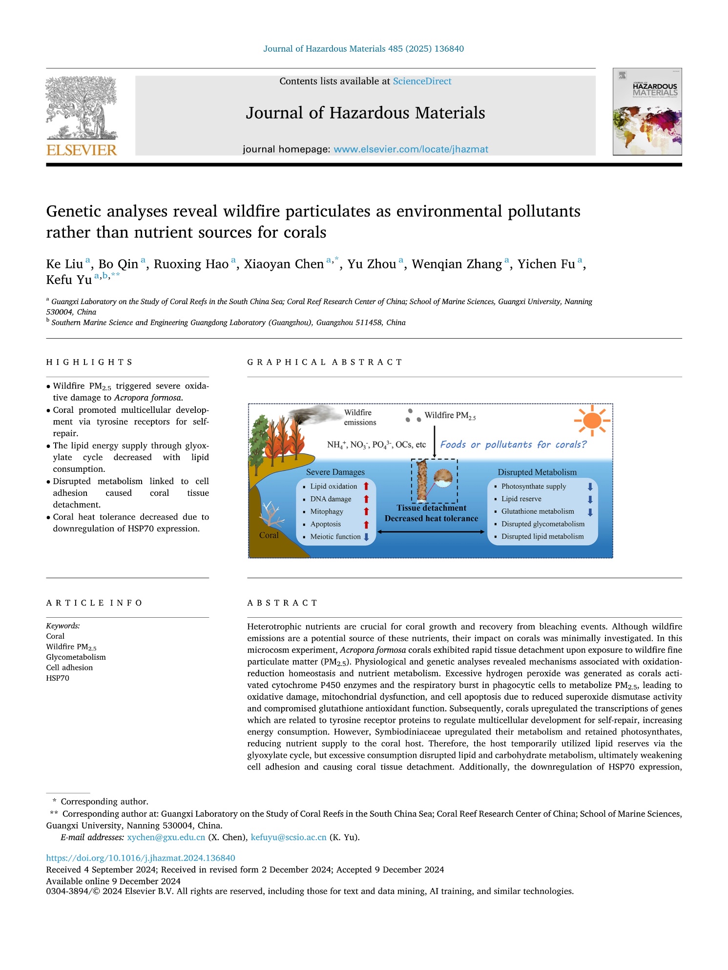 近日,公司博士研究生刘珂在导师陈小燕副教授等的指导下,以第一作者在国际期刊Journal of Hazardous Materials发表研究论文“Genetic analyses reveal wildfire particulates as environmental pollutants rather than nutrient sources for corals”