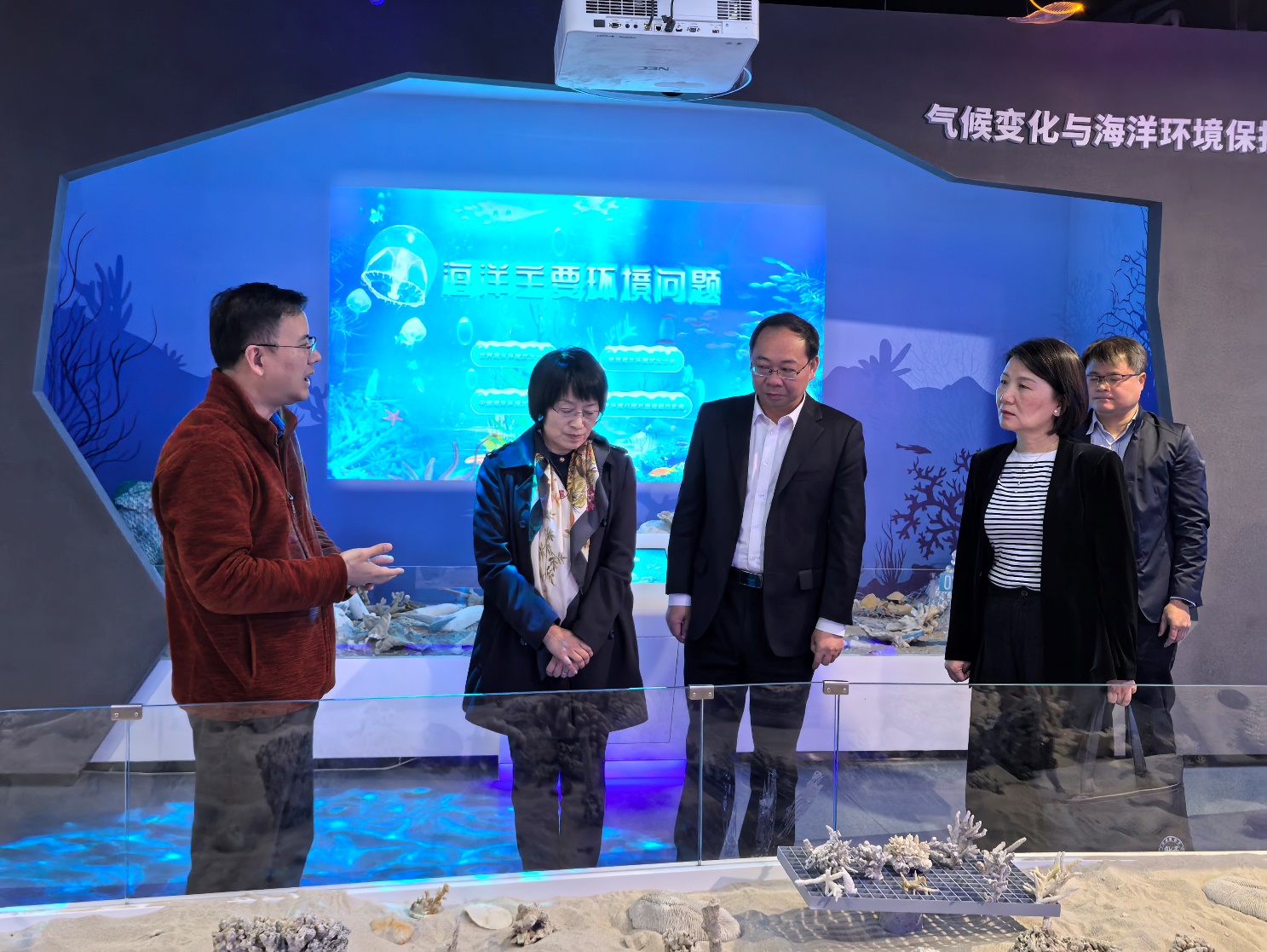 在海洋科教馆,科教馆常务副馆长李周佳向调研组汇报了公司在南海岛礁建设、海洋科考、生态环境保护等方面开展的工作情况。尤其是参与编写《黄岩岛海域生态环境调查评估报告》,充分展示了我国南海海洋生态环境保护成效,为服务国家政治外交大局提供了支撑保障。在岛礁生态修复实验室,调研组观看了活体珊瑚的人工培育,观看了涠洲岛陆基和海区可视化监控系统运行状况,了解了公司成立珊瑚礁保护与修复研究团队,研发以“人工修复带动自然恢复”为理念的珊瑚礁生态修复技术,建立了2000平方米的自然海域珊瑚修复示范区,经过3年的努力实现了活珊瑚覆盖率从5%提高到20%,带动了周边海域珊瑚礁的自然恢复。赵浩对伟德国际victor1946聚焦珊瑚礁研究所取得的成效给予了高度评价,她建议两校进一步加强在科技成果转化、学科交叉融合等方面的合作。