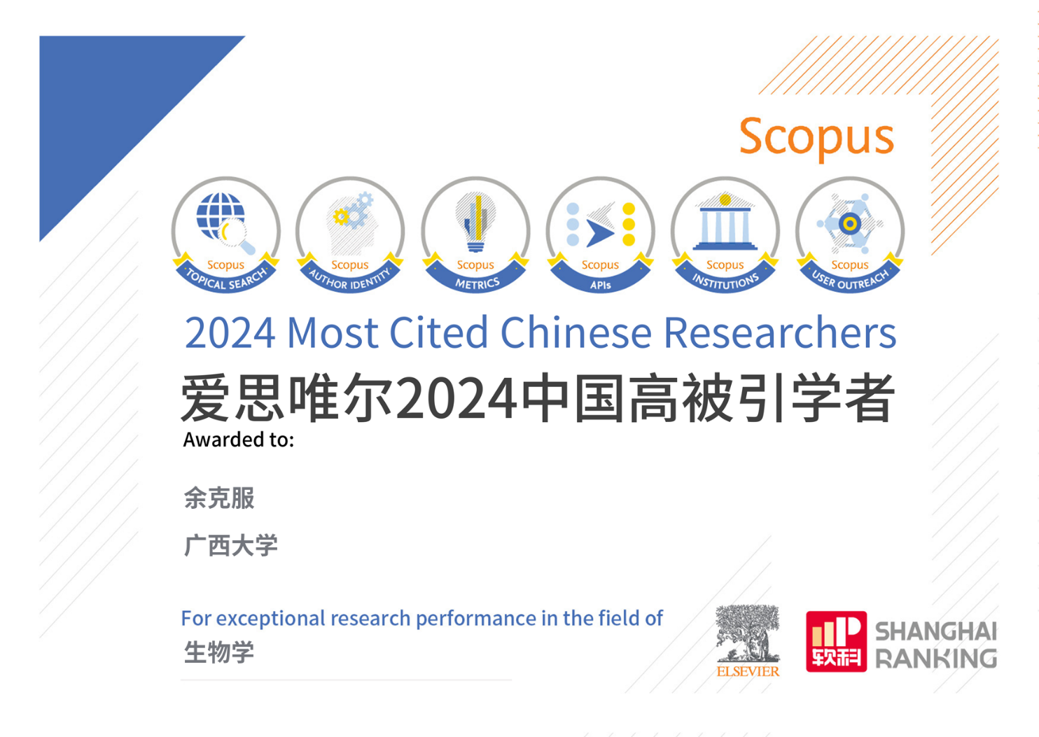 近日,爱思唯尔(Elsevier)发布了2024年度“中国高被引学者”榜单,全国共有6388位学者上榜。公司余克服和徐向荣教授分别入选生物学、海洋科学领域“中国高被引学者”。
