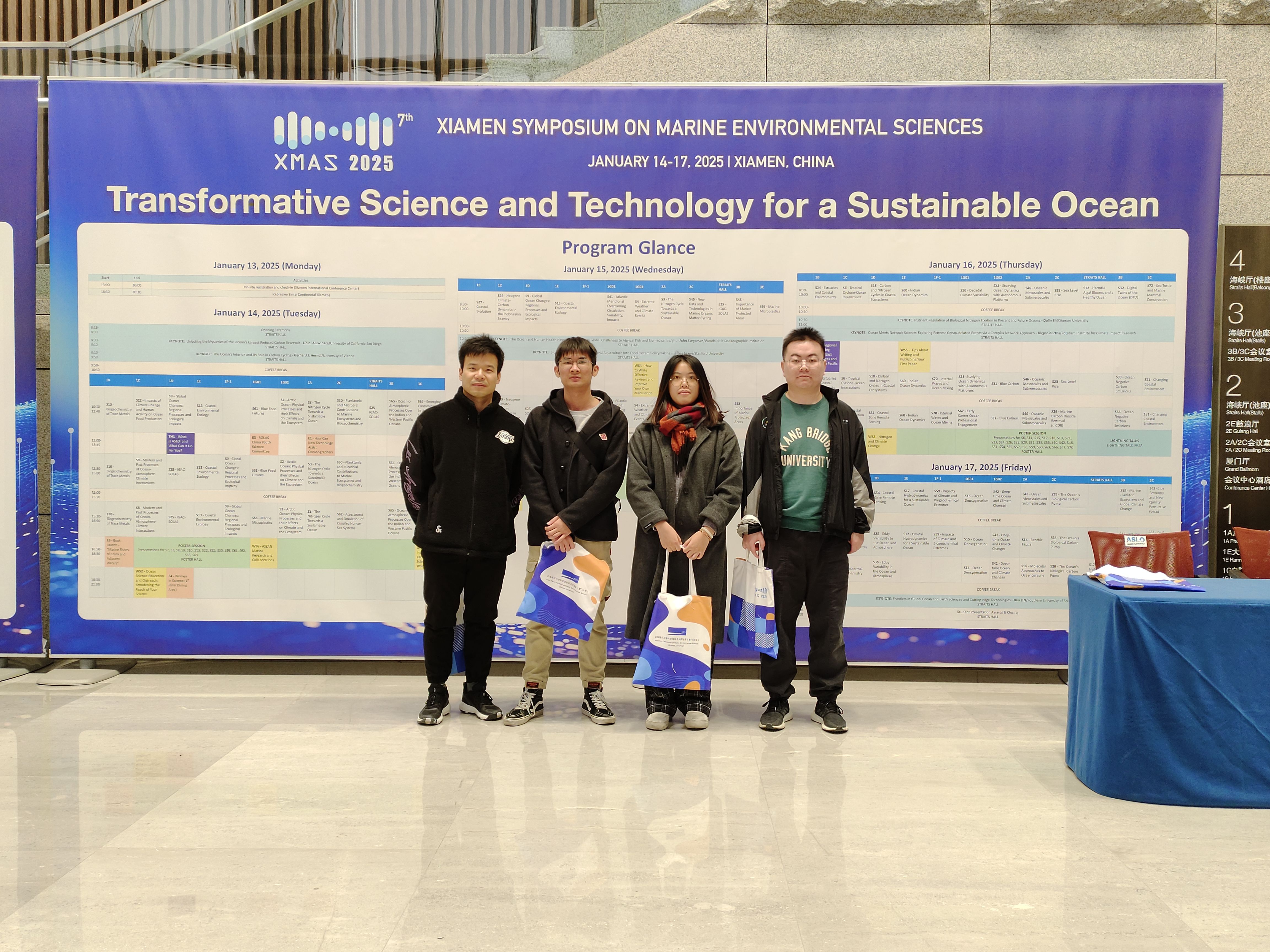 公司陈小燕副教授课题组彭润乾、吴秋昀、闫兆千和刘珂等4名研究生获得“bv伟德国际1946研究生倍增计划-研究生素质能力提升项目”资助,于2025年1月14日至17日,前往中国福建省厦门市参加了第七届厦门海洋环境科学研讨会(The 7th Xiamen Symposium on Marine Environmental Sciences)。在海洋表层与低层大气中的化学和物理学分会场(Chemistry and physics at surface ocean and lower atmosphere)作了题为“Wildfire Particulates Enhance Phytoplankton Growth and Alter Communities in the South China Sea Under Wind-Driven Upwelling”和“Coral Nutritional Strategies in Response to Wildfire Ash Deposition”展板报告。