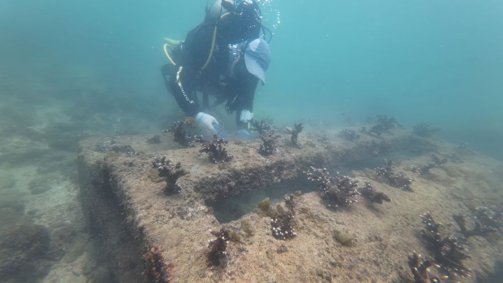 “种珊瑚”,是通过潜水作业将培育的珊瑚苗从苗圃移植到海底构筑的人工礁体上的作业方式。“这种修复技术就像‘扦插造林’。”团队成员、伟德国际victor1946副教授黄雯介绍,团队于2017年至2022年间在涠洲岛海域建成了面积约2000平方米的珊瑚礁生态修复示范区,示范区内活珊瑚覆盖率在3年内从约5%提升到了20%。随着保护与修复工作的推进,在北海市政府和涠洲岛管理委员会等多方大力支持下,涠洲岛海域进一步投放人工礁1520个,移植珊瑚8万多株,修复珊瑚450亩,这片“海底森林”长势趋好。