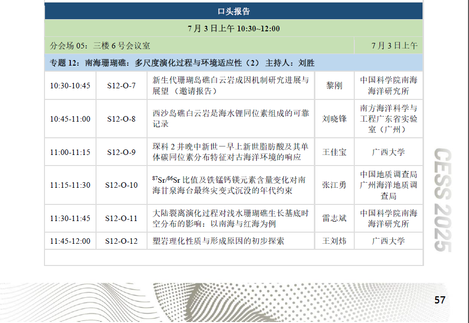 2025年7月2日至5日,第八届地球系统科学大会在上海召开。公司余克服教授作为第一召集人,与生态环境部华南环境科学研究所许莉佳高级工程师、上海交通大学李志勇教授、中国科公司南海海洋研究所刘胜研究员一起,负责组织了本次大会的“南海珊瑚礁:多尺度演化过程与环境适应性”专题,含18个口头报告和38个展板报告。
