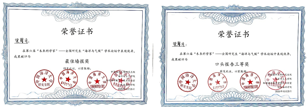 在本次论坛中,公司2024级硕士研究生梁馨月表现优异,荣获“优秀口头报告三等奖”及“最佳墙报奖”。她的报告题目为《造礁石珊瑚共附生微生物对潮间带波动生境的响应模式》,分别在口头报告与墙报展示环节进行了精彩汇报。