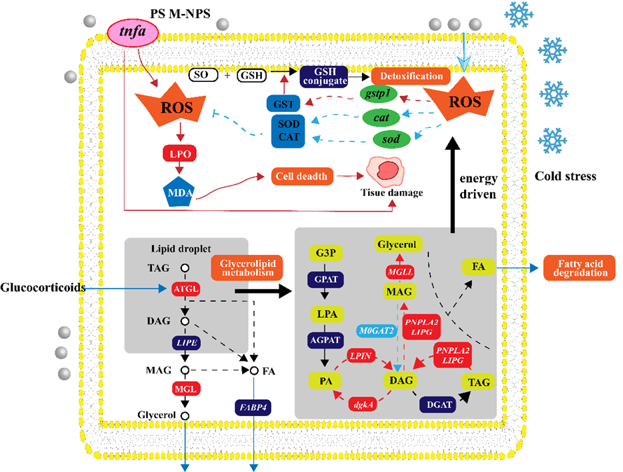 聚焦这一关键科学问题,团队通过系统研究取得多项重要发现:在富集规律上,微纳塑料在鱼体内的分布呈现明显 “尺寸偏好”:纳米塑料主要靶向富集于肝脏,湿组织中含量最高达 22.94 μg/g,成为肝脏内的微型 “破坏者”;微塑料则更倾向于分布在消化器官,悄悄干扰消化功能。组织病理学观察显示,石斑鱼肝脏在微纳塑料暴露下出现肝细胞肿胀、炎症、空泡变性等损伤,原本储存能量的脂滴数量显著减少,且损伤程度随塑料颗粒尺寸减小而加剧,证实纳米塑料的毒性显著强于微塑料。在代谢层面,微纳塑料引发了一系列 “连锁危机”:氧化应激升级,SOD 与 CAT 等 “抗氧化卫士” 活性下降,MDA 与 GSH 等 “氧化损伤标志物” 含量升高;脂质代谢失衡,甘油三酯(TG)减少,总胆固醇(T-CHO)和低密度脂蛋白胆固醇(LDL-C)升高,机体被迫加速分解脂肪供能;397-499 个差异表达基因被激活,其中 PNPLA2、MGLL 等脂肪分解相关基因异常活跃,低温条件下更为显著,导致能量稳态失衡。研究进一步明确,微纳塑料通过三重途径威胁石斑鱼越冬生存:激活免疫反应增加能量需求、直接调控脂肪分解基因加速脂滴消耗、干扰甘油三酯分解与转运,三者共同作用导致低温下石斑鱼能量储备快速耗尽,死亡风险大幅上升。