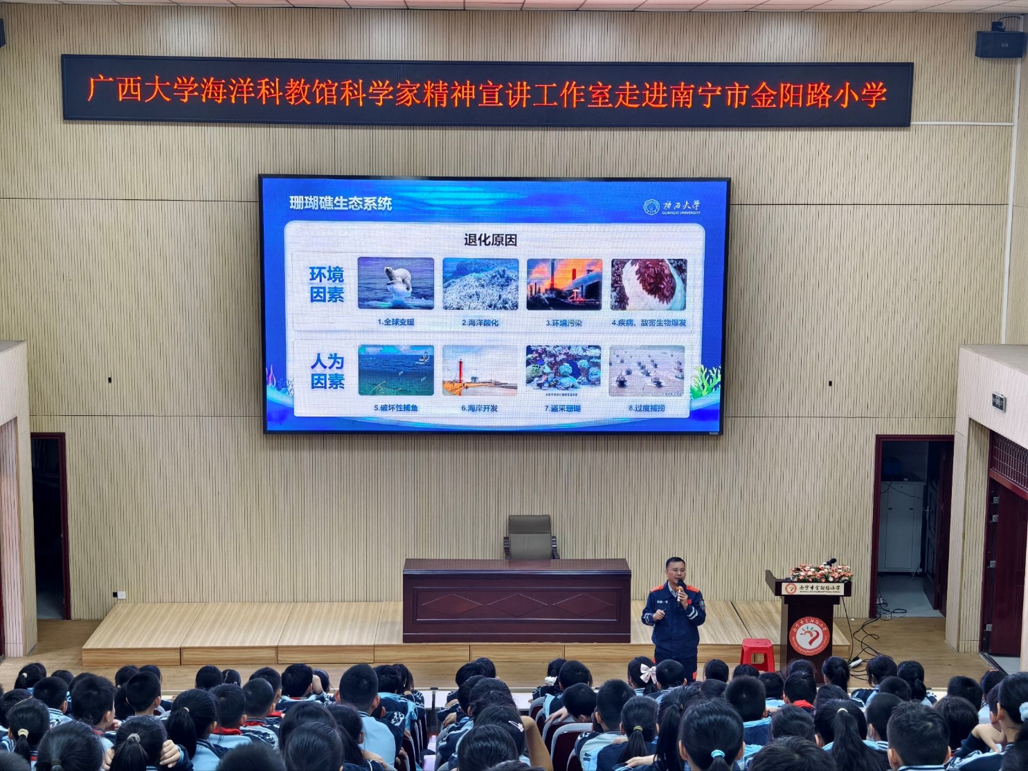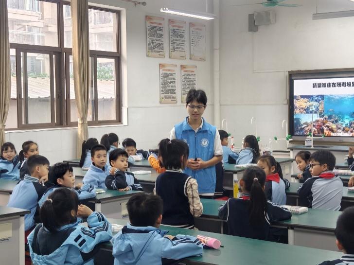 11月27日,伟德国际victor1946“蓝色梦想”科普队携国家自然科学基金科学传播类专项项目,再次走进南宁市金阳路小学,成功举办第六场海洋科普课。本次课程以“科学家精神传递与海洋奥秘探索”为主题,创新采用“双讲堂”并行模式,融信念传递、知识讲解与互动实践于一体,为师生带来一场沉浸式的海洋科普体验,进一步激发青少年的家园情怀与海洋保护意识。