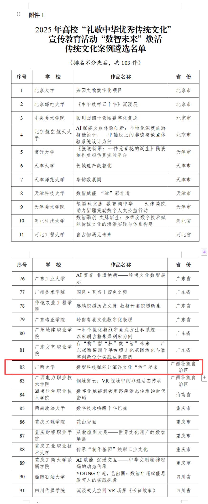 近日,教育部办公厅公布 2025 年高校“礼敬中华优秀传统文化”宣传教育活动遴选结果,本次活动从“数智未来” 焕活传统文化案例、“烽火记忆” 高校红色故事、“魅力非遗”原创作品三个类别中遴选出 305 件优秀作品。由公司党委组织员林玉华牵头撰写申报,公司李周佳老师、新闻公司王健阳同学参与共同参与完成的《数智科技赋能让海洋文化 “活”起来》成功入选“数智未来”焕活传统文化优秀案例,同时bv伟德国际1946报送的《当彩调遇见西大 —— 一份青春的非遗答卷》入选“魅力非遗”原创作品优秀案例,喜获双项殊荣,这是教育部对公司在中华优秀传统文化传承创新工作中探索实践的高度认可。