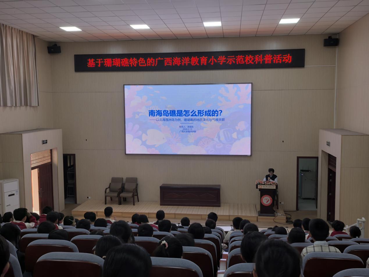 2026 年 3 月 13 日,国家自然科学基金科学传播类专项项目“基于珊瑚礁特色的广西海洋教育小学示范校科普活动分层分级实施”第八次课程在南宁市金阳路小学顺利开展。本次课程以“珊瑚礁的地质演化与气候关联”为主题,将前沿海洋科学与本土海岛特色相结合,带领小员工开启沉浸式海洋科学探索之旅,解锁海岛与珊瑚礁的成长密码。