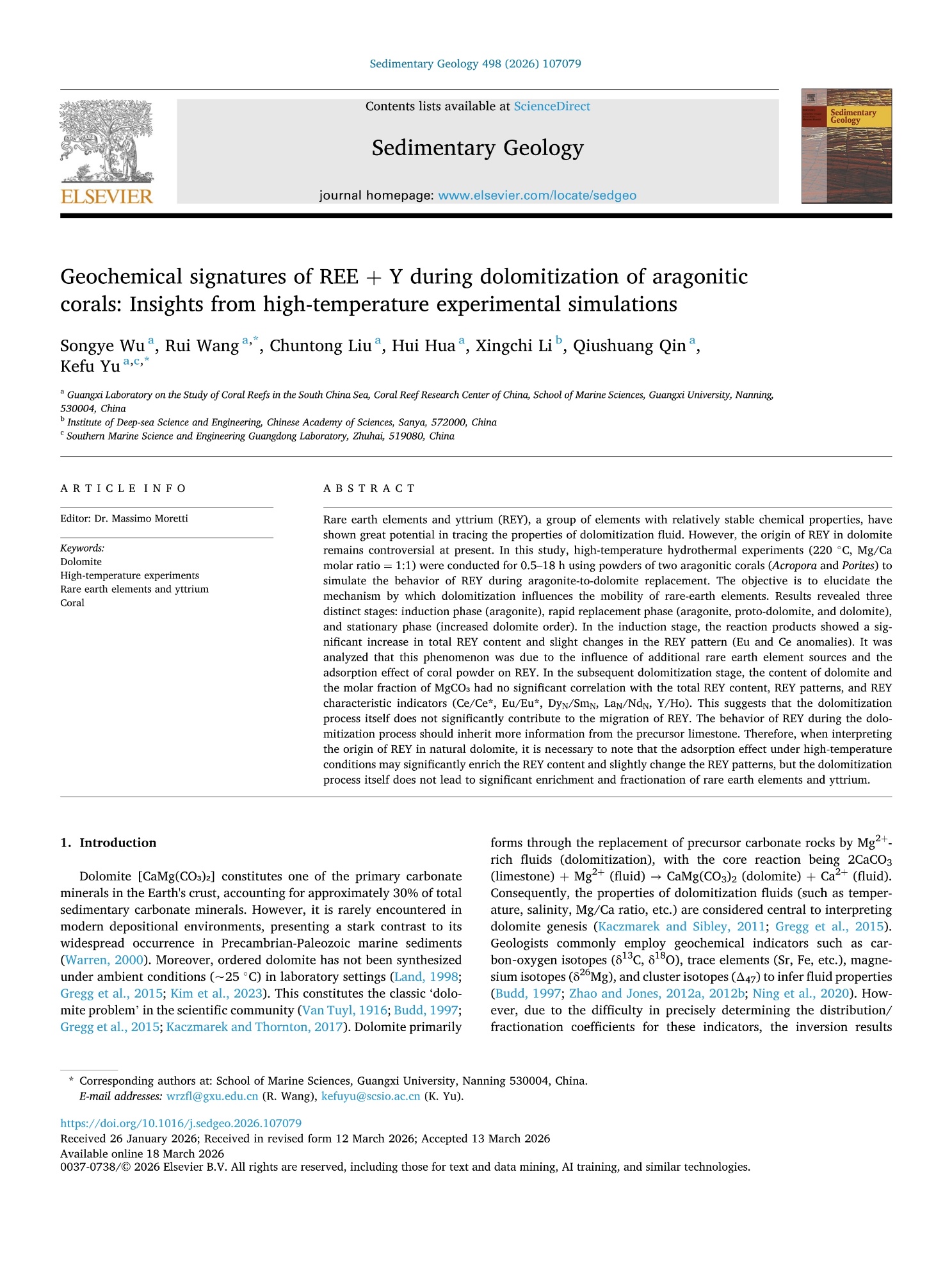 Wu Songye ,Wang Rui, Liu Chuntong, Hua Hui, Li Xingchi, Qin Qiushuang, Yu Kefu.(2026). Geochemical Signatures of REE+Y During Dolomitization of Aragonitic Corals: Insights from High-Temperature Experimental Simulations. Sedimentary Geology 498(2026)107079.