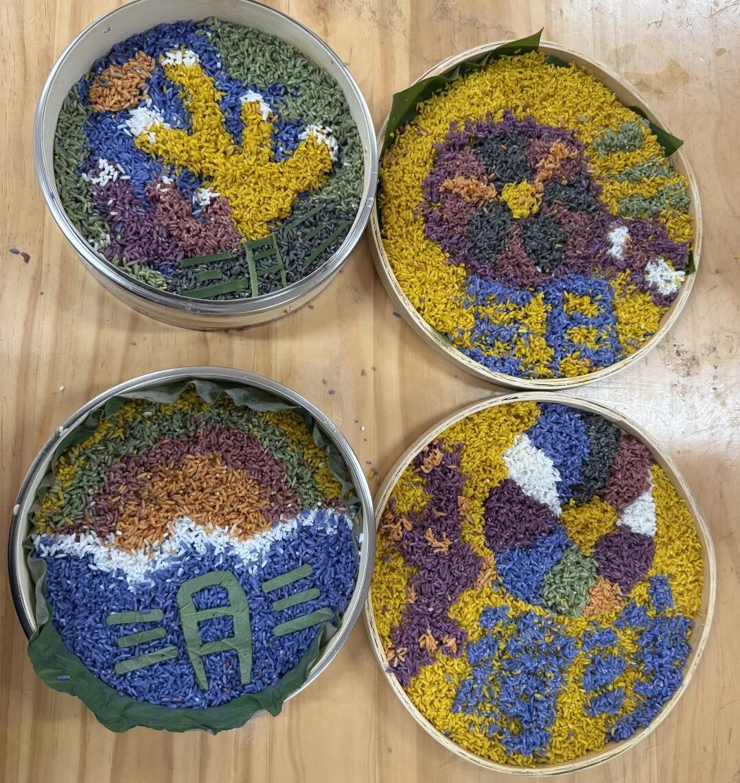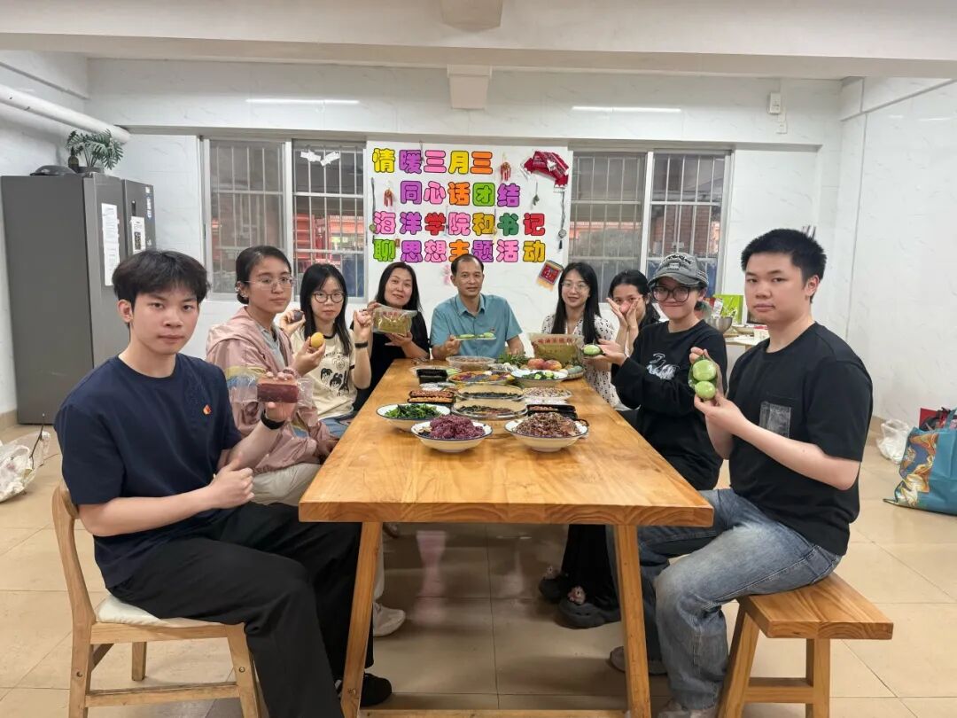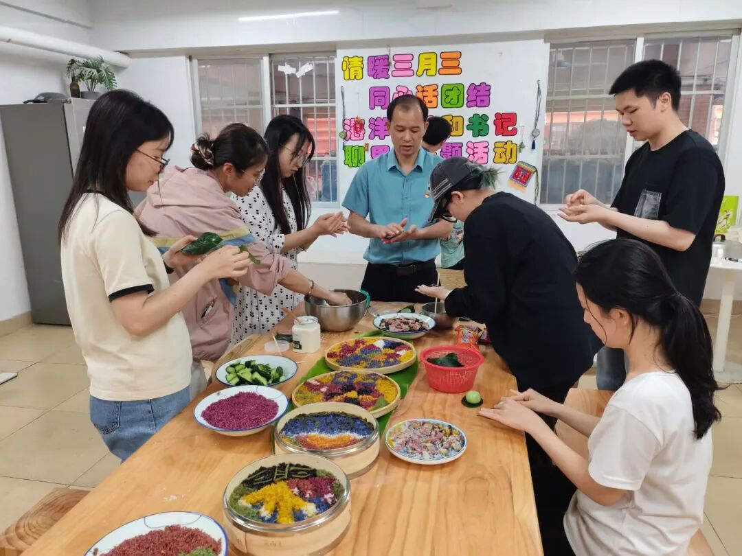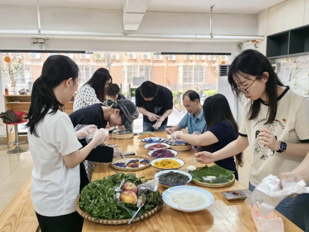 在美食制作环节,师生们混合编组,共同投入五色糯米饭蒸制和艾叶糍粑制作。大家挽起衣袖,揉面、包馅,上锅蒸艾叶糍粑;熬煮各种植物、染色拌米,将象征吉祥的五色糯米精心拼出民族特色和海洋特色图案。等待美食出炉期间,趣味横生的碰彩蛋活动引得笑声不断,思政教育在轻松愉悦的烟火气中变得有滋有味。